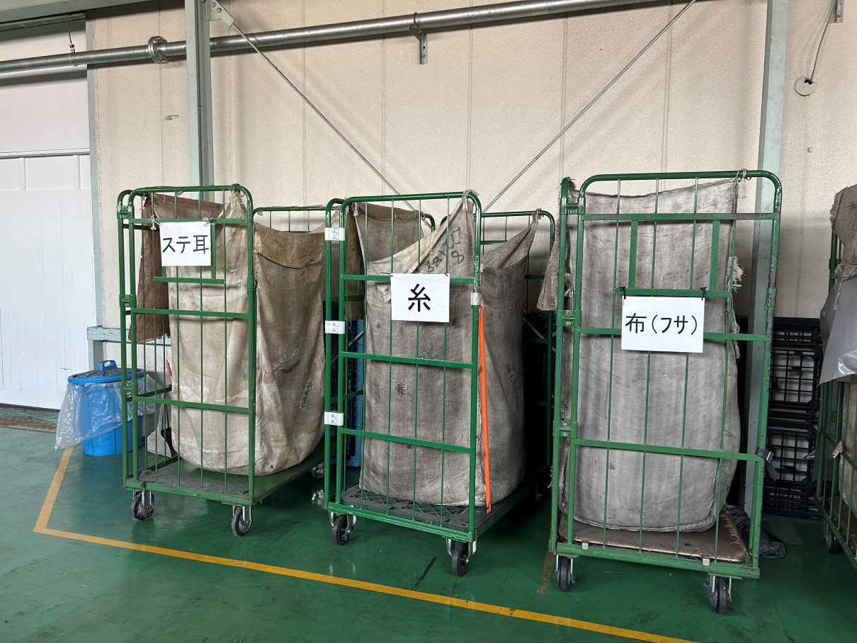 工場内の見学でまず最初に目にしたのが、ステ耳・糸・布(フサ)と札が掛けられたワゴンです。これらはものづくりの際にロスになる部分ですが、中伝毛織さまでは自社で回収し再利用するものづくりも行っています。