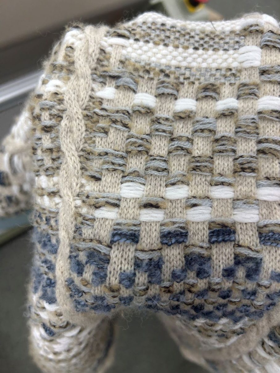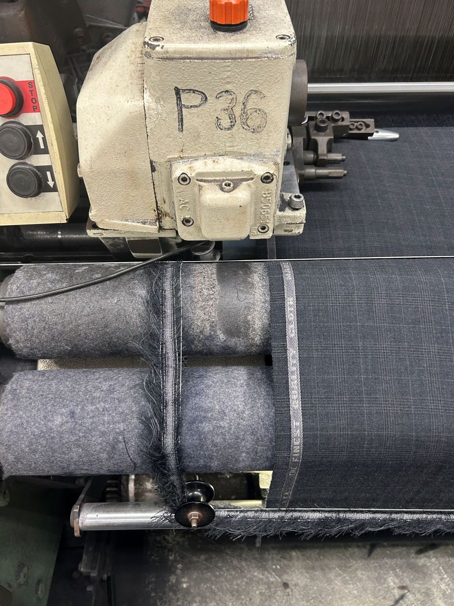 レピアにも得意不得意があります。例えば、太番手のファンシーヤーンと細番手の糸を緯糸に使用する場合、糸の太さのギャップがありすぎることで、消極レピアの部品に引っかかり損ねたり、糸切れが生じやすくなるそうです。「糸を物理的にしっかりとつまんで運ぶ」ことでそのような課題を乗り越えられる最新の織機を見ることができました。このように、中伝毛織さまでは、技術と最新機械をもって、バリエーション豊かで複雑な組織の織物を安定して生産することが可能になっています。