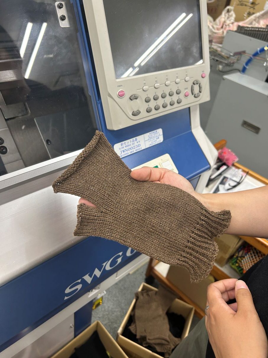 もちろん、サンプル用の小さな横編み機で製品編みもしており、冒頭でご紹介したような残糸を使用してアップサイクルの小物づくりが行われていました。